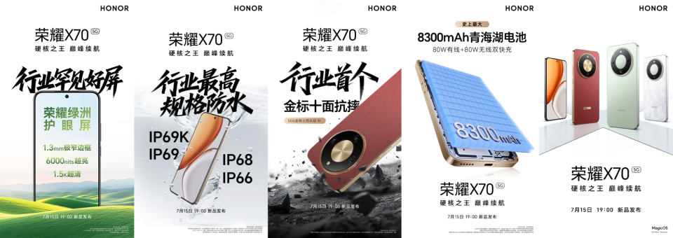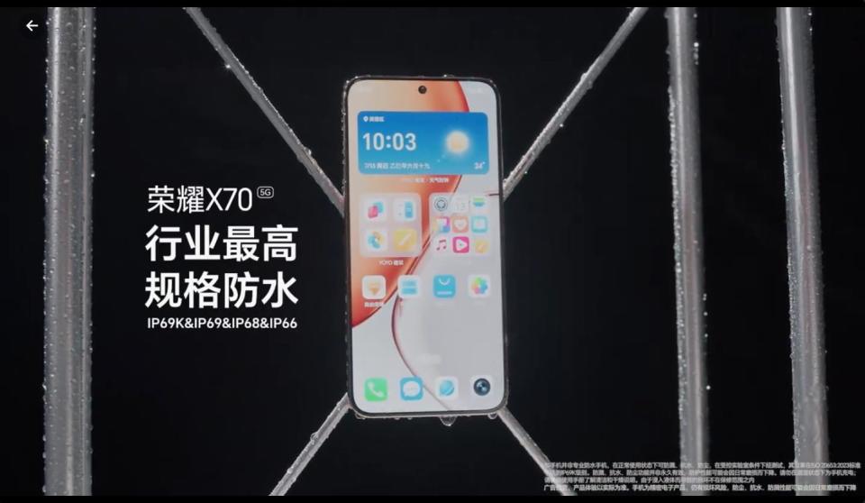 根据目前官宣的信息显示,荣耀X70采用一块6000nits超亮、1.5K分辨率的荣耀绿洲护眼屏,拥有1.3mm极窄边框,内置目前行业容量最大的8300mAh青海湖电池,支持80W有线+80W无线双快充(仅512GB版支持);是行业首个通过SGS金标三防认证的机型,十面里外都抗摔;获得了IP69K&IP69&IP68&IP66满级防尘防水认证。无论是防泡水、喷水还是高温水,在不同场景下都能为手机提供全面防护,即便万次入水也无需担忧。